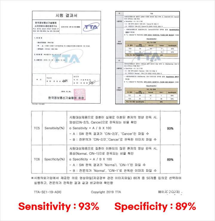 - 분당서울대학병원, 고려대병원 산부인과 공동연구 데이터 기반- 자체개발 인공지능 알고리즘 AidotNet v1.2(민감도 93%, 특이도 89% - TTA공인시험성적)