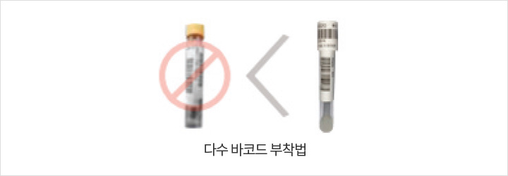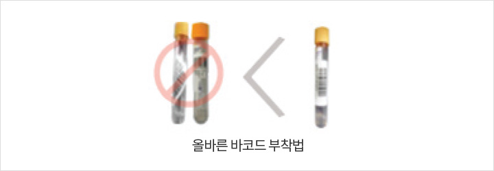 - 05 튜브 형태의 검체용기는 바코드 리더기가 읽기 용이하도록 세로 형식으로 부착하며, 검체 상태와 검체량확인이 가능하도록 바코드를 부착합니다.