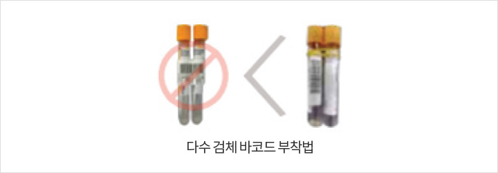 - 04 채취부위 또는 채취 시간이 다른 동일 종류의 검체로 동일 종목의 검사를 의뢰할 경우에는 각각 서로 다른 바코드를 부착해야 합니다. 바코드가 동일하면 각각 독립된 작업번호가 부여되지 않아 제대로 검사가 될 수 없습니다.