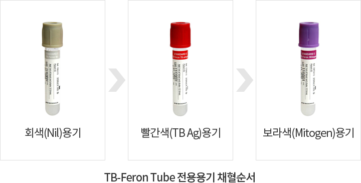 - 03 반드시 회색(Nil) → 빨간색(TB Ag) → 보라색(Mitogen)용기 순서로 1.0mL씩 채혈 후(검은 선까지) 즉시 전용용기 벽면의 내용물(antigen)이 혈액과 잘 섞일 수 있도록 상하로 10회, 또는 5초 동안 반복 혼합합니다.