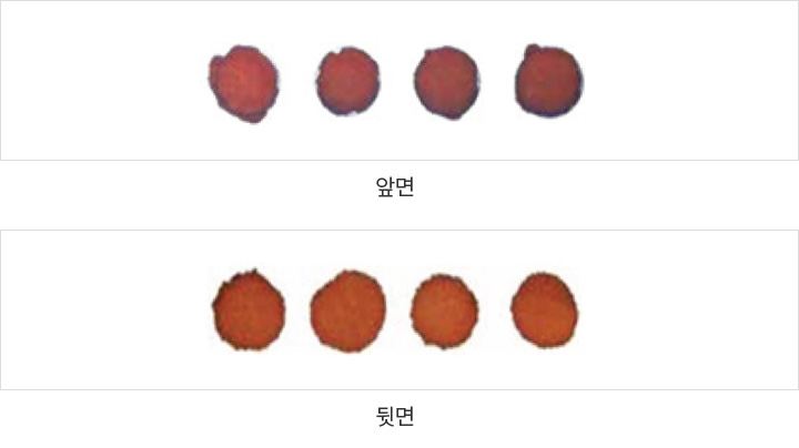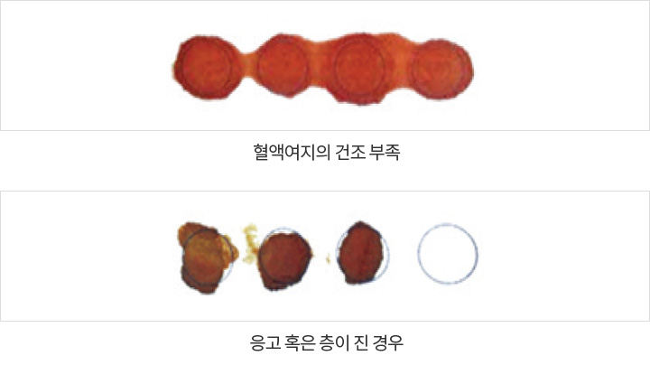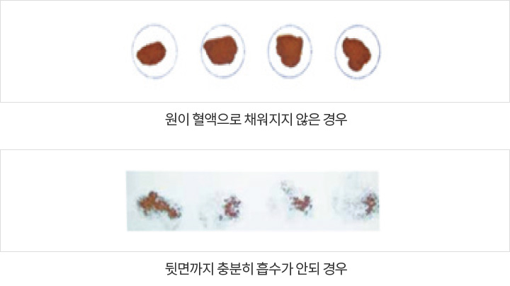 - 01 적합 검체 : 혈액여지 4개의 원이 가득 차고, 앞·뒷면에 혈액이 충분히 흡수