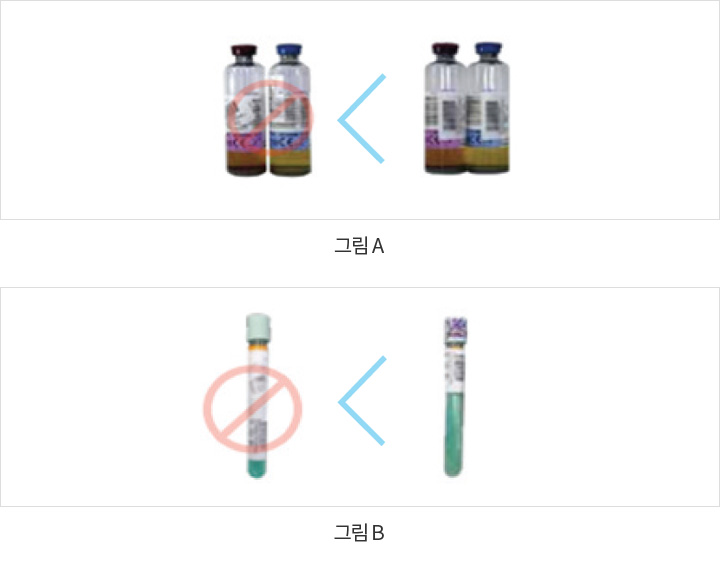 - 06 혈액배양용기에 붙어있는 바코드가 보존되도록 발행된 바코드를 다른 위치에 세로로 부착합니다 (그림 A).