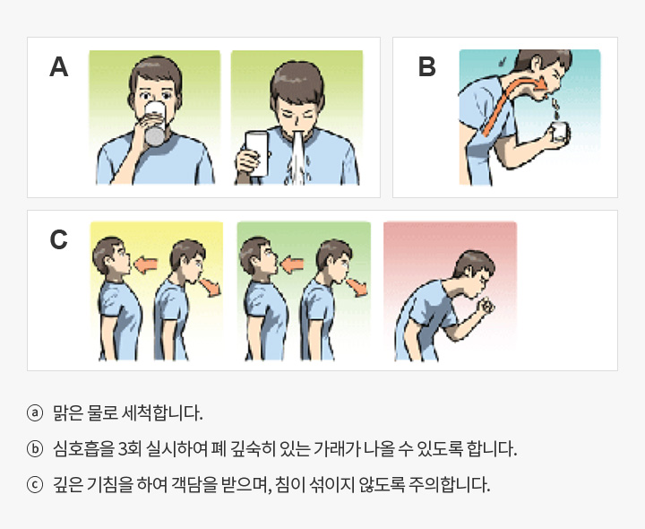 - ① 객담은 폐렴의 원인균을 진단하기 위해서 사용하며, 아침에 일어나 양치한 후 큰기침을 하여 무균컵에 채취합니다. (객담을 받을 수 없는 소아환자는 흡인으로 채취합니다).