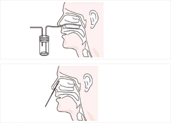 - ③ 비강흡입물 채취 시에는 비강을 통하여 카테터 끝이 인두 후벽까지 다다르게 한 다음 진공 흡입을 걸고 카테터를 약간씩 돌리며 천천히 부드럽게 빼내면 됩니다. 진공흡입 후 카테터가 비인후부에 10초 이상 길게 머물지 않도록 주의합니다.